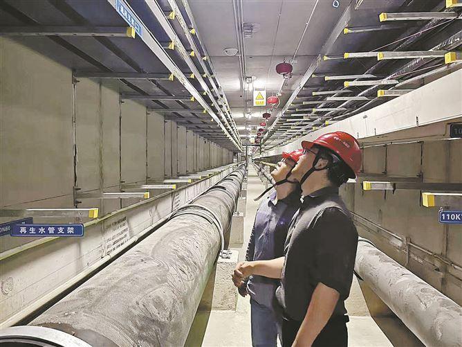 据悉,该项目全长4.456公里,采用单舱断面型式,沿环嶝路集约化敷设综合管廊。管廊内部集成了110KV及10KV电力电缆、通信电缆、给水管、污水管及再生水管等多类市政管线。此举能有效消除片区内“马路拉链”和“空中蜘蛛网”等顽疾,提升城市景观与管线运行安全水平。图为工作人员在管廊内部开展检查工作。