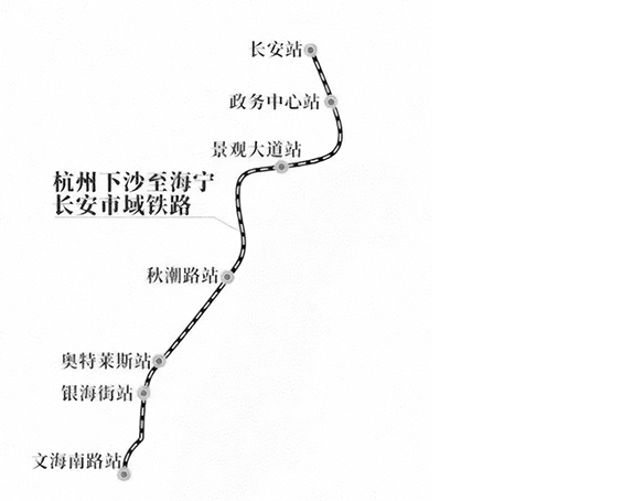 下沙至长安市域铁路全长约20.8公里,呈南北走向,全线共设7座车站。线路南起杭州钱塘区的文海南路,沿千帆路向北延伸,进入嘉兴高新区后,再沿安澜路、启航路等道路前行,最终抵达海宁长安站(东方学院),并与杭海城际铁路实现换乘。